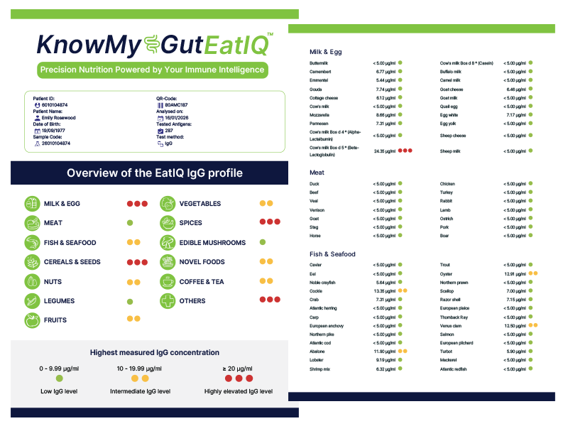 Your blood sample is analysed using EatIQ™ Food Intelligence Technology, measuring IgG immune responses across hundreds of food markers.